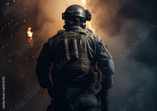 © Kowit, Fototapeta premium 4th of July concep. portrait of A soldier in front of a flag of the USA. The soldier with the gun in front of a flag. portrait soldie standing in front of usa flag. Non-existent person. Generative Ai