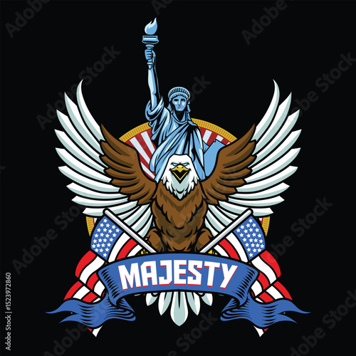© Adam Vector Station, Fototapeta premium 4th of July Independence Day Bald Eagle with American Flag Shield and Liberty Statue Illustration
