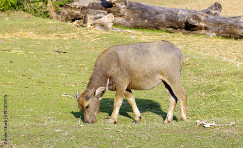 Fototapeta premium Thai buffalo eating grass on rice farm in Thailand.