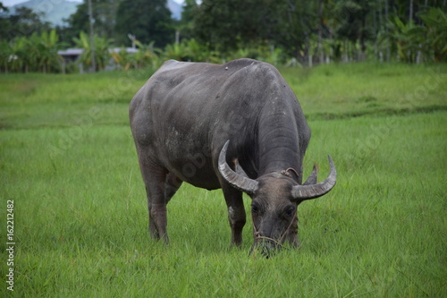 © Pimonpan, Fototapeta premium Thai buffalo eating on the grass field.