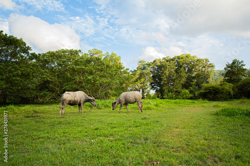 Fototapeta premium Thai buffalo is grown in bright green fields, at Phuket, Thailand.
