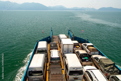 © Thomas, Naklejka premium Thai ferry boat with cars on deck at sea to Koh Chiang Thailand