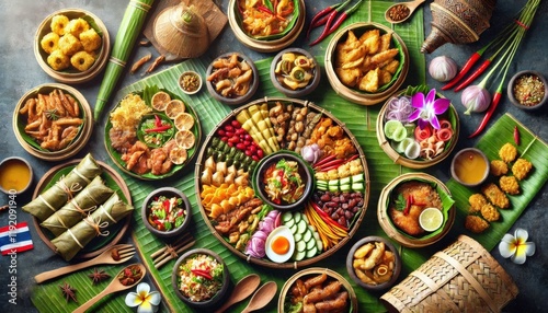 Fototapeta premium Thai food dishes laid out on a platter with herbs, bowls, and wooden...