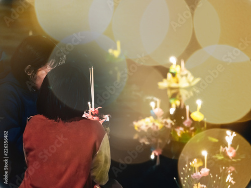 © tickcharoen04, Fototapeta premium thai people pray and hold hand made krathong by flower from loykratong festival and thailand culture on november