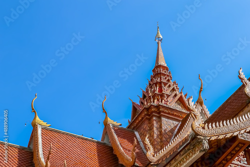 Fototapeta premium Thai style roof of Buddhist temple with blue sky.