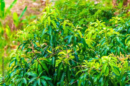 Obraz premium Thailand background tropical green mountain jungle forest rainforest trees plants.