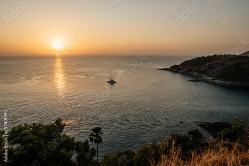 Fototapeta premium Thailand, 2020: drone shot from above, panoramic ocean view on sunset with trees and cliffs