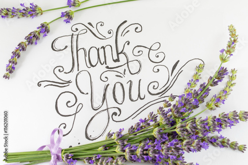 © creativefamily, Fototapeta premium Thank you card with lavender flowers on table
