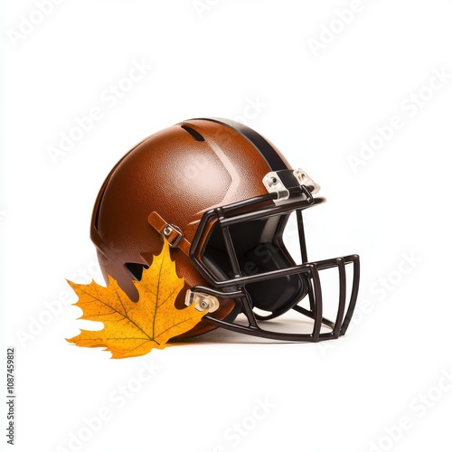 Naklejka premium Thanksgiving American football Brown football helmet with a vibrant autumn leaf beside it.