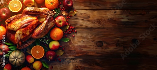 © spyrakot, Naklejka premium Thanksgiving Feast Banner with Roasted Turkey and Seasonal Fruits on Rustic Wooden Background