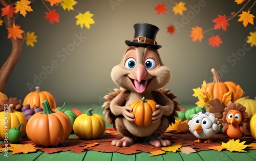 Naklejka premium Thanksgiving Turkey holding a pumpkin.