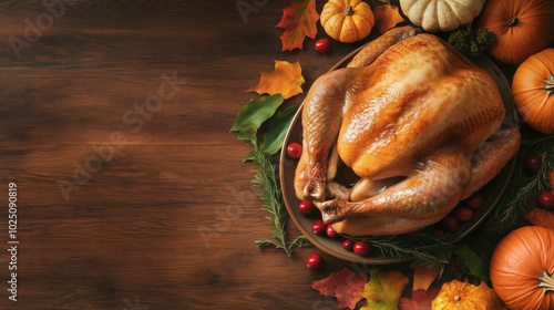 © OHMAl2T, Fototapeta premium Thanksgiving turkey surrounded by autumn decorations on a wooden table