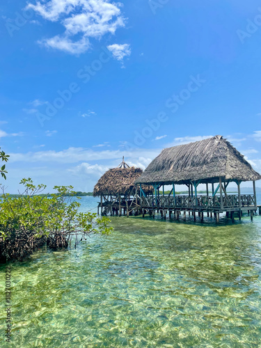 © Rawf8, Fototapeta premium Thatched hut on wooden stilts over clear Caribbean waters near Bocas del Toro, Panama. Cloudy tropical sky