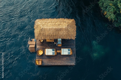 © Roey, Fototapeta premium Thatched-Roof Floating Dock with Lounge Chairs Over Tropical River. Relaxing Deck Scene with Natural Surroundings.