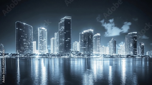 Fototapeta premium The abstract futuristic style of Florida coastal technology city scenery is filled with dynamic lighting connected by digital technology, showcasing modern concepts of networking and data transmission