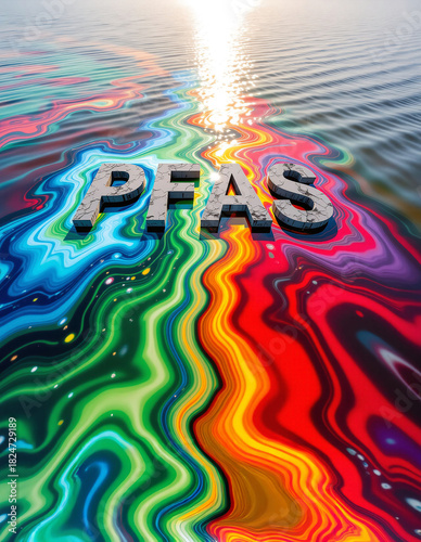 © DBA, Naklejka premium The acronym PFAS, rendered in stone texture, emerges from a surface of water contaminated by vibrant, swirling chemical residue and sunlight.
