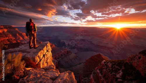 © Nawarit, Fototapeta premium The adventurous spirit of solo travel, a backpacker standing at the edge of a majestic canyon at sunrise