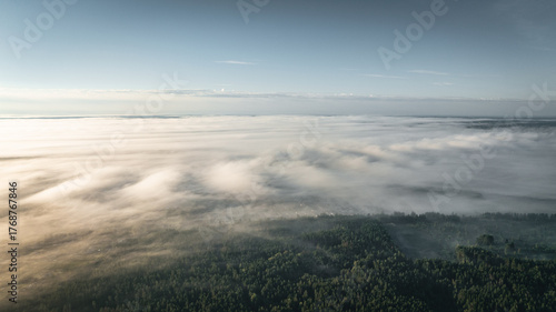 © Pavel Babic, Fototapeta premium The aerial view captures a serene forest blanketed in morning mist under a clear blue sky. Vilnius, Lithuania