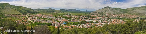 © Алексей Мараховец, Obraz premium The aerial view on old Trebinje city in the lowland surrounded with mountains in summer against cloudy sky in Bosnia and Herzegovina.