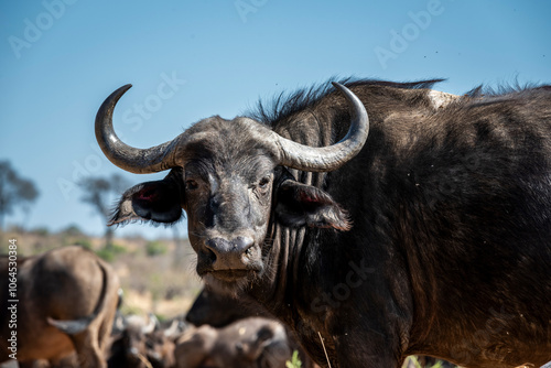 Fototapeta premium The African buffalo, Syncerus caffer, is a formidable herbivore native to the diverse landscapes of sub-Saharan Africa. These bovines, often referred to as Cape buffalo, Syncerus caffer caffer.