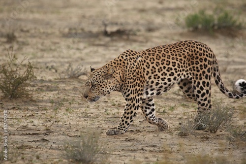 Obraz premium The African leopard (Panthera pardus pardus) walking in dry sand in Kalahari...