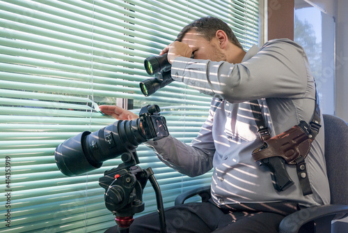 Obraz premium The agent is looking at the binoculars and sitting near the blinds