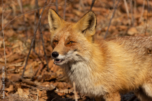 Fototapeta premium The aggressive fox looks threatening and prepares to attack.