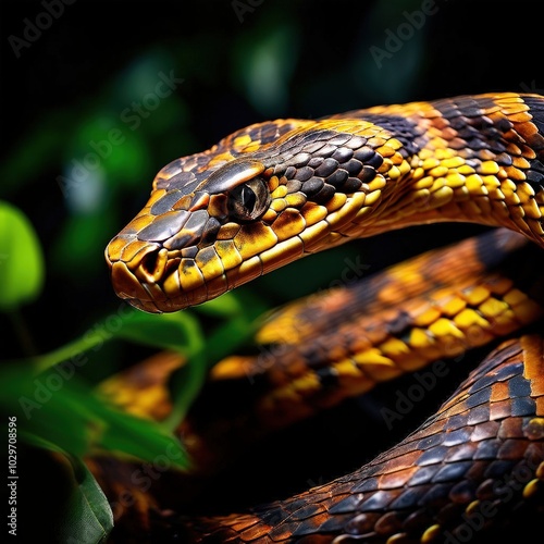 © law, Obraz premium the AI Image Generator, Coiled snake revealing shimmering golden eyes amidst