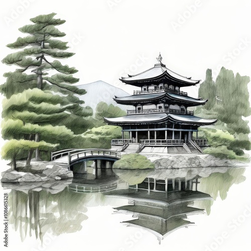 © boying, Naklejka premium the AI Image Generator, Japanese Temple Pencil Drawing