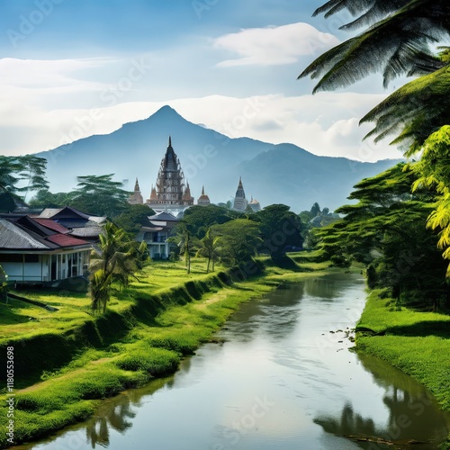 Naklejka premium the AI Image Generator, Village Around Traditional Asian Temple at Sunrise