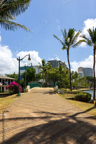 Fototapeta premium the Ala Wai Canal Path along the Ala Wai Canal with lush green palm trees, flowers, hotels and luxury condos, blue sky and clouds in Honolulu Hawaii USA
