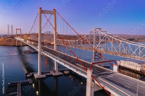 © Zenstratus, Obraz premium The Alfred Zampa Memorial Bridge carries vehicles across the Carquinez Strait in Crockett, California, USA. The image shows the bridge at dusk with light trails from cars.