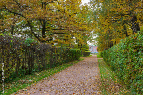 © 1802185, Fototapeta premium The alley is surrounded by autumn trees. Golden autumn is in the old Park. Kuskovo, Moscow, Russia.