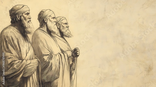 Fototapeta premium The Allotment for Ephraim: Ephraim’s leaders ready to receive inheritance, standing before Joshua, biblical illustration, Beige Background