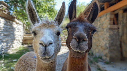 © acnaleksy, Obraz premium The alpaca looks into the camera lens, close-up of the funny muzzle