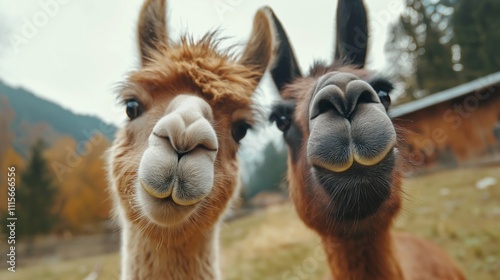 © acnaleksy, Fototapeta premium The alpaca looks into the camera lens, close-up of the funny muzzle
