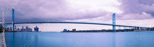 Naklejka premium The Ambassador Bridge across the Detroit River connecting Detroit, Michigan in the United States with Windsor, Ontario in Canada, a panoramic long-exposure photography