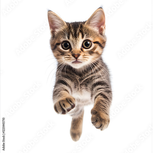 © JB, Obraz premium the American shorthair tabby breed cat jumping. white background