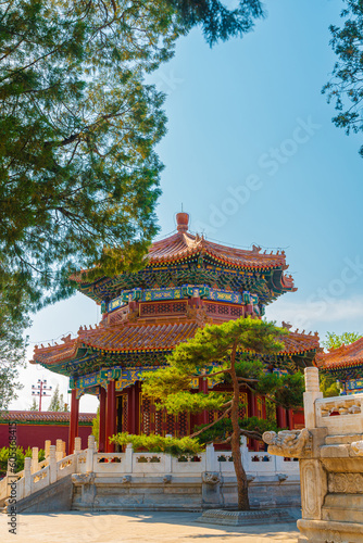 Naklejka premium The ancient building of Shouhuang Hall in Beijing Jingshan Park under the...