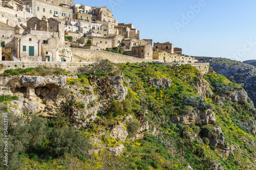 Fototapeta premium The ancient ghost town of Matera (Sassi di Matera) in beautiful yellow flower in daylight, southern Italy
