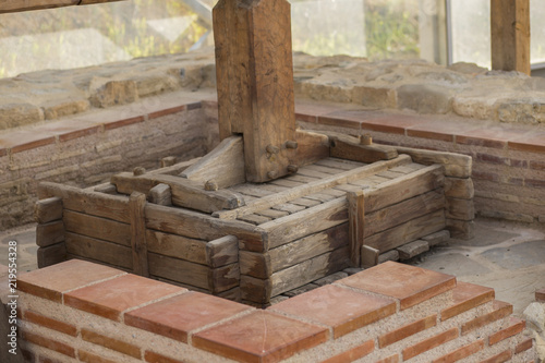© Piotr, Fototapeta premium The ancient tradition of grape processing. The squeezer is used to press the wine. Excavation of the civilization of the ancient Greeks. Winery of the 5th century in the ancient fortress in Byala.