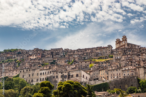 © Ragemax, Obraz premium The ancient village of Artena (Montefortino), in the Lepini Mountains, in the valley of the Sacco River. The dense agglomeration of houses of the town, which rises perched along a limestone ridge