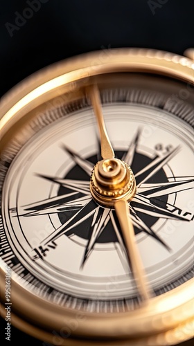 © Viktoriia Kan, Fototapeta premium The antique compass displays a golden body and intricate craftsmanship, with the needle visibly oriented north, set against a contrasting dark background