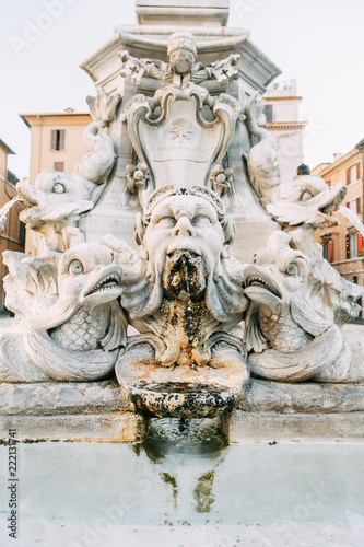 Fototapeta premium The architecture of Rome and the Italian style in stucco. Sights of the old town, tourist places. Street art, world heritage. Miracle of light. Carved columns and capitals. Ancient structure