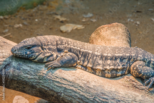 Fototapeta premium The Argentine black and white tegu (Salvator merianae) is a species of lizard in the family Teiidae. It is an omnivorous species which inhabits the tropical rain forests, savannas and semi-deserts.