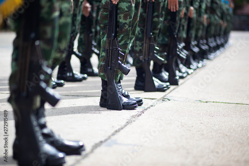 © arter photo , Naklejka premium The Army soldier stand in row they are wear hat and wear Military vest.