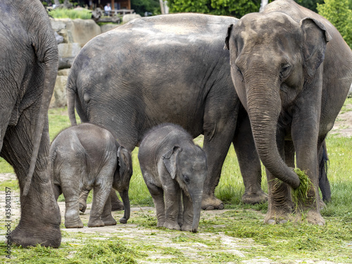 © vladislav333222, Fototapeta premium The Asian Elephant, Elephas maximus, several months old, is still staying close to its mothers