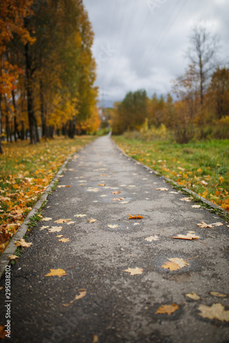 Fototapeta premium The asphalt road goes into the distance between the yellow trees in autumn. Autumn fallen yellow leaves on the road
