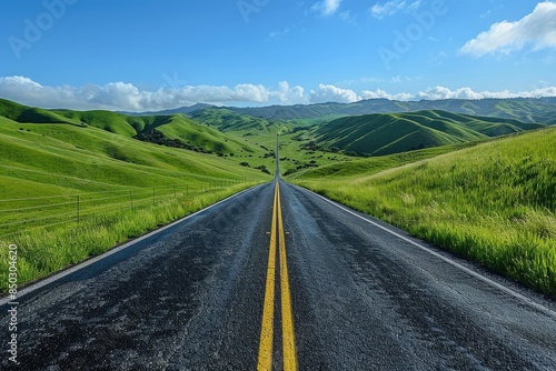 Fototapeta premium The asphalt road leading to the distance on the grassland