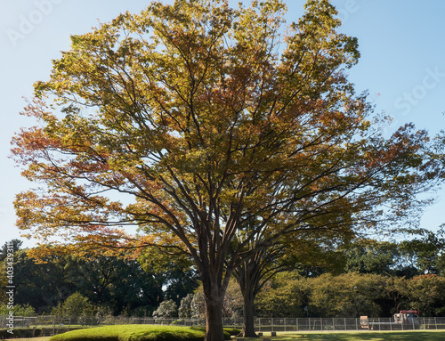 © Serg Zastavkin, Naklejka premium The autumn colored trees at the Honmaru O-shibafu (lawn). Imperial Palace garden. Tokyo. Japan